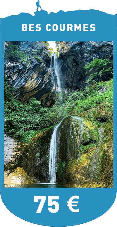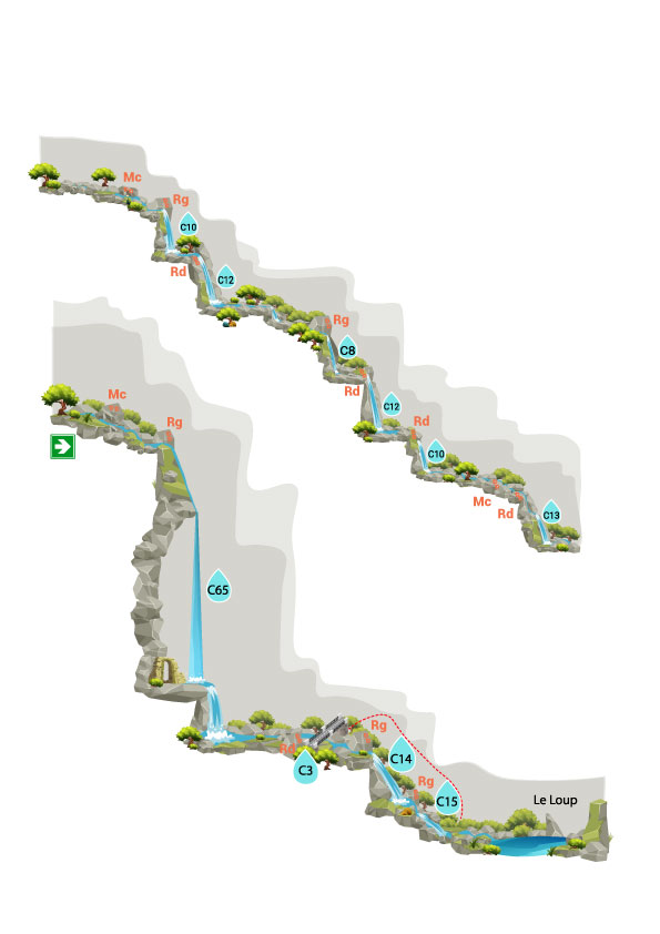 Parcours technique avec initiation au rappel, 10 descentes de 3 mètres sur plans inclinés jusqu’à la cascade finale. Le chemin d’accès en partant du bas de la cascade est interdit par la commune de Courmes. Il faudra donc faire une navette voiture.