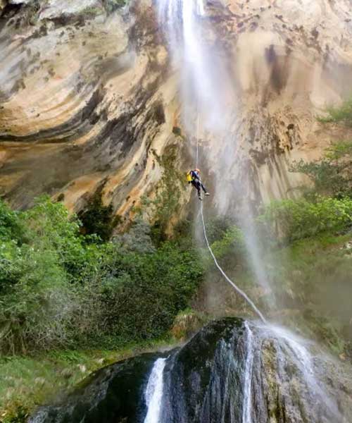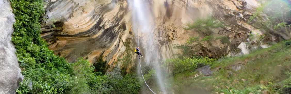 Les rappels s’enchaînent avec un bel encaissement. Le parcours de Bès Courmes continue avec un rappel idyllique de 65 mètres en fil d’araignée. Il faudra bien gérer ses frottements et la communication avec l’équipe car il y a peu de visuel avec le bas de la cascade.