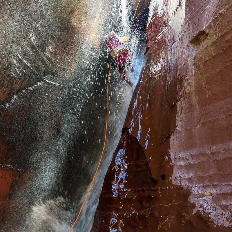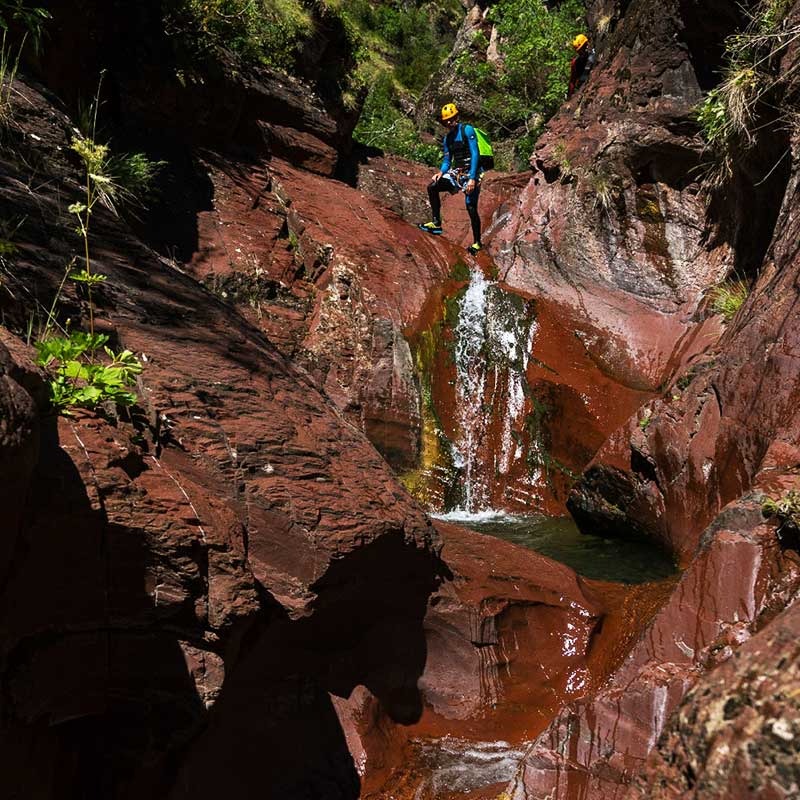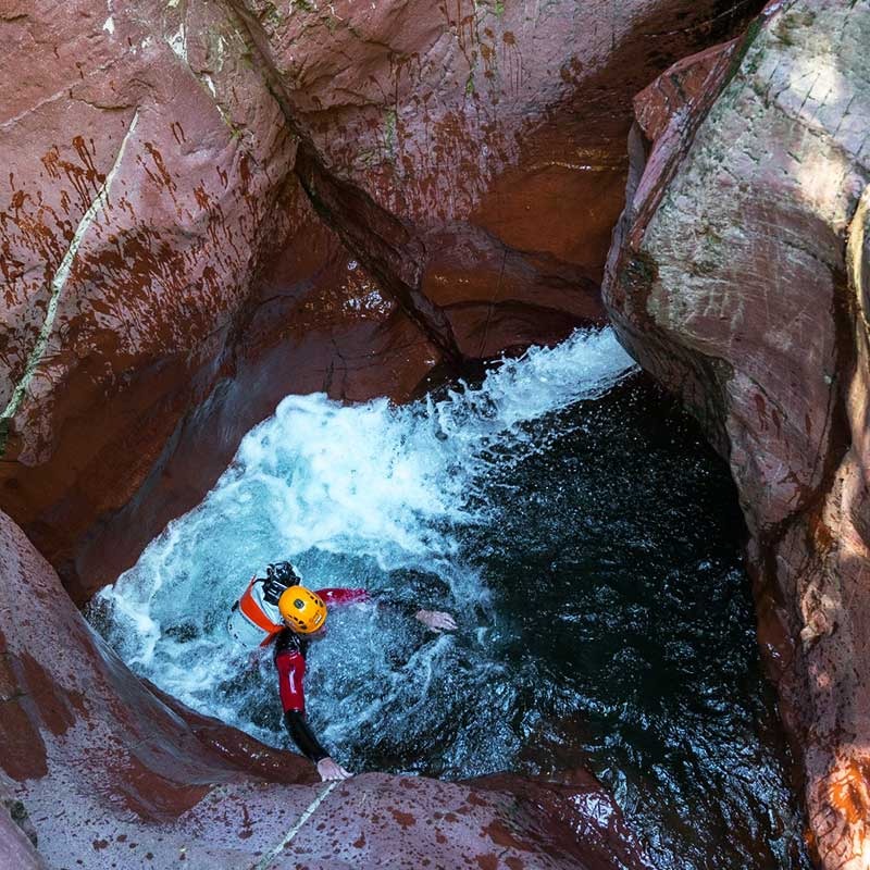 Tout au long du parcours, la progression alterne passages étroits, marmites profondes, sections de marche aquatique et rappels parfois arrosés dans une roche rouge spectaculaire. Le canyon compte plusieurs dizaines de cascades et plus d’une centaine de vasques sculptées par l’érosion.